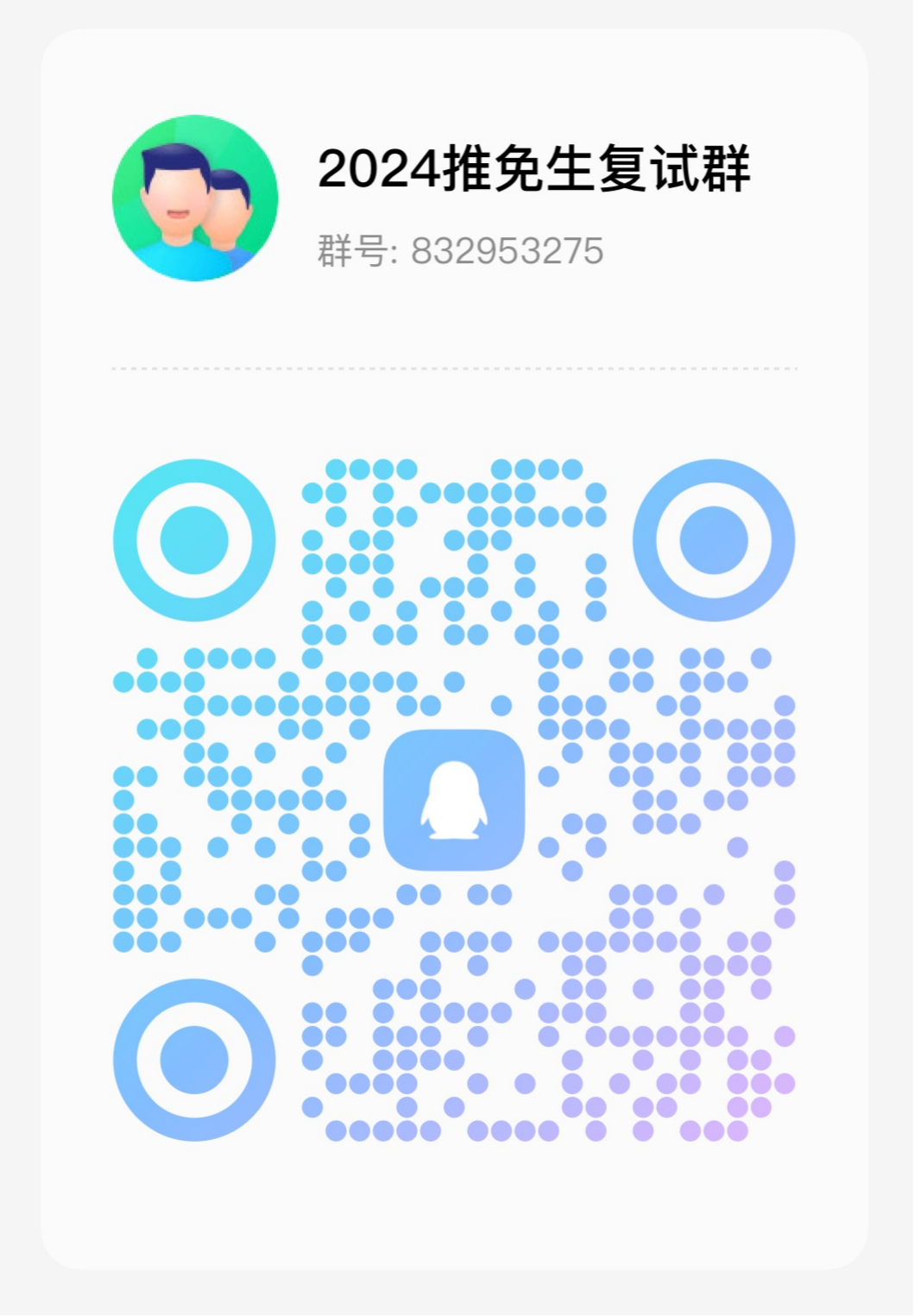 QQ群名称:2024推免生复试群,群号:832953275。请实名申请入群,并修改群名片为“姓名+在读高校名称”
