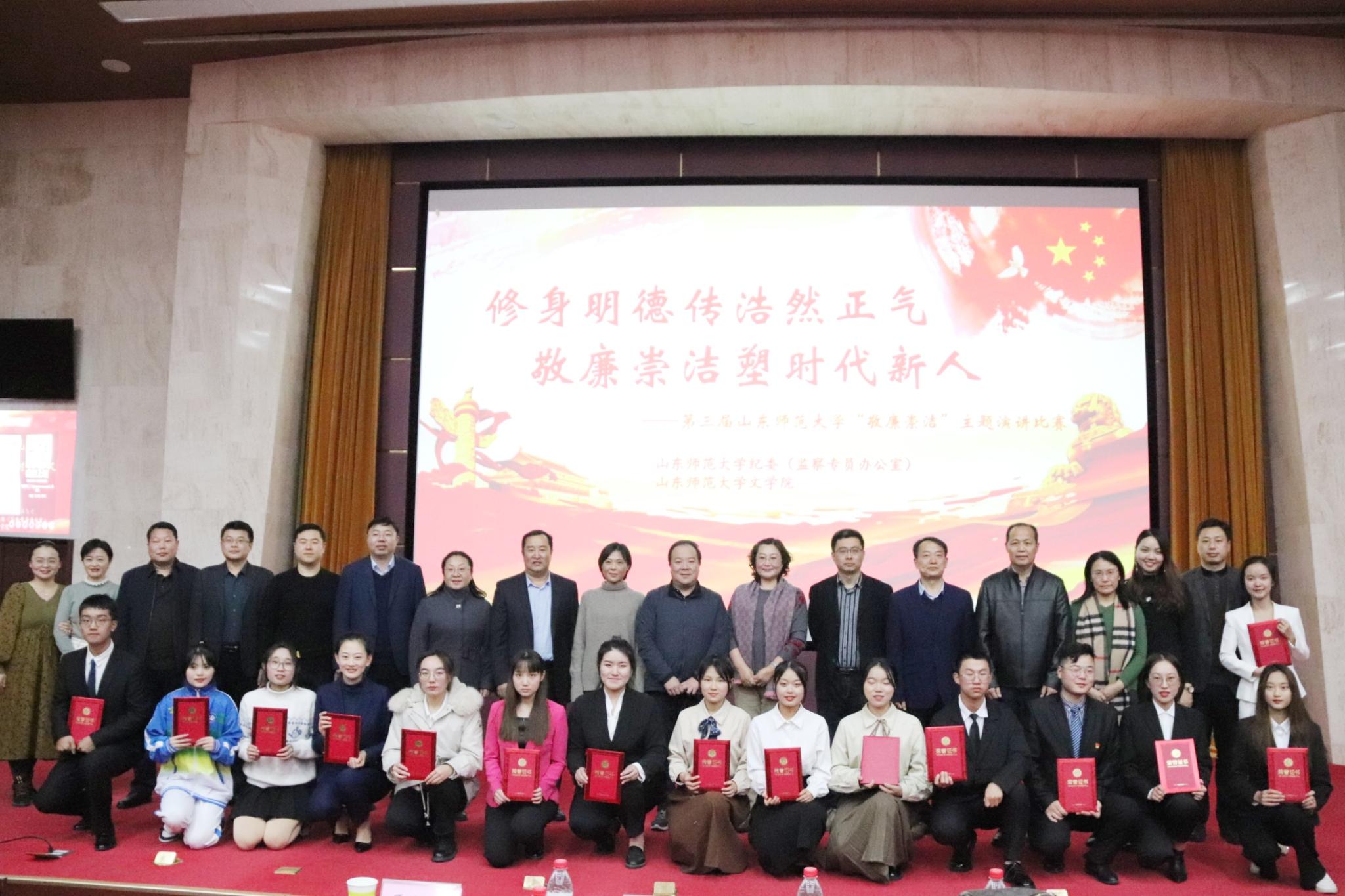 12月2日,山东师范大学第三届“敬廉崇洁”主题演讲比赛决赛在千佛山校区教学三楼报告厅举行。本次比赛由山东师范大学纪委(监察专员办公室)和文学院联合主办,学校纪委副书记兼纪委办公室主任王发科、正处级纪检员王志强,ug环球会员登录党委书记刘彧,文学院党委书记肖光军,部分选手所在单位分管学生工作的领导出席决赛,300多名研究生、本科生现场观看了比赛。刘静敏、常庆、贾娇燕、张萌、刘亚担任比赛评委。ug环球会员登录2021级研究生周旦代表学院参加此次比赛。