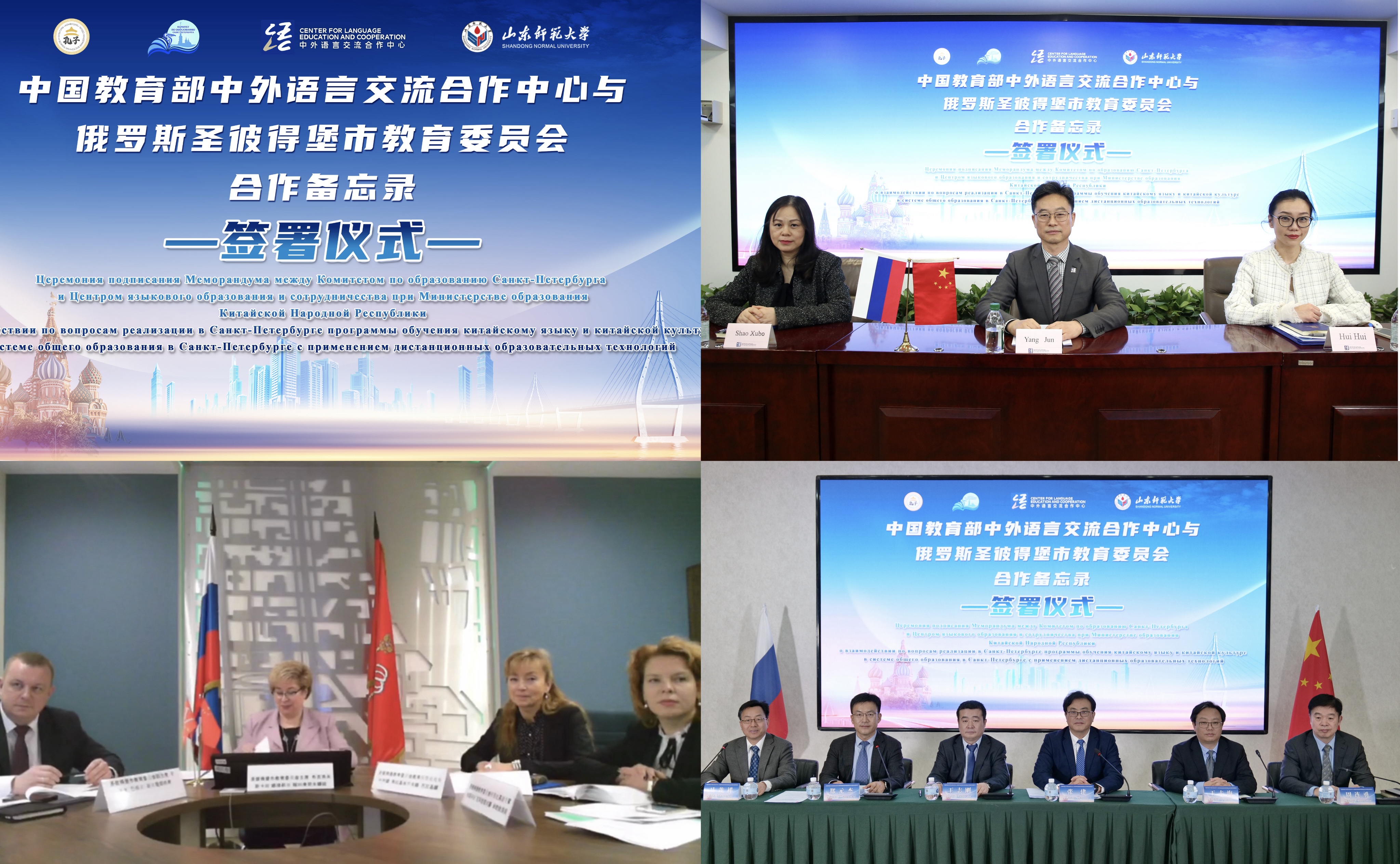 2024年1月31日,中国教育部语合中心与圣彼得堡市教育委员会签署关于使用远程教育技术在圣彼得堡普及教育体系中开展中文与中国文化教学的备忘录签署仪式在线上举行。中外语言交流合作中心副主任杨军,俄罗斯圣彼得堡市教育委员会主席布吉洛夫斯卡娅·娜塔莉亚、副主席罗泽夫·巴维尔、师资处处长巴拉金娜·叶莲娜、师资处高级专家米哈伊洛娃·娜塔莉亚,山东省教育厅总督学王志刚,山东师范大学校长张建、副校长郑元杰,俄罗斯圣彼得堡“孔子”东方语言文化学院院长张蕈丽等出席。山东省教育厅国际交流与合作处、山东师范大学国际交流与合作处、ug环球会员登录负责人参加仪式。仪式由郑元杰教授主持。